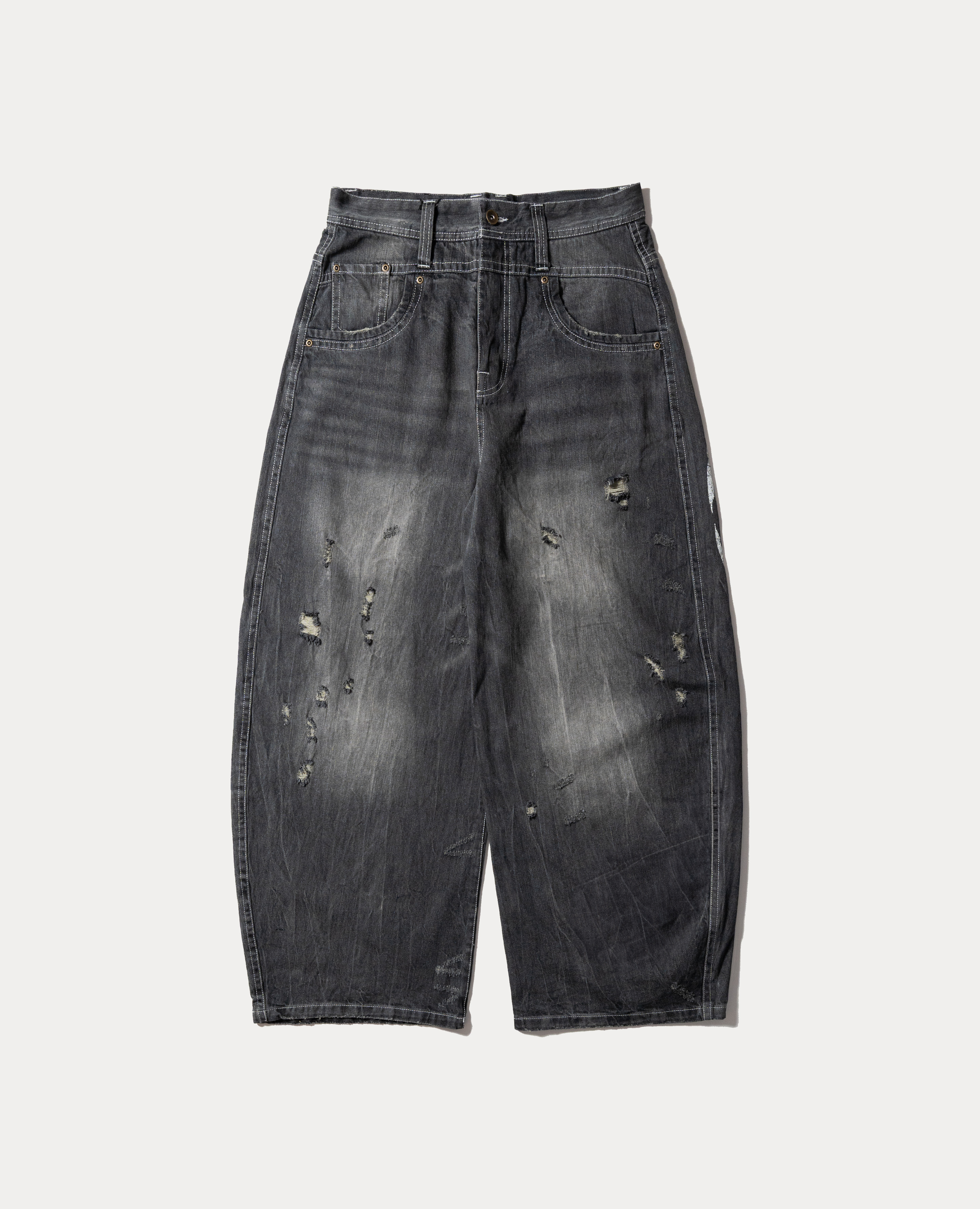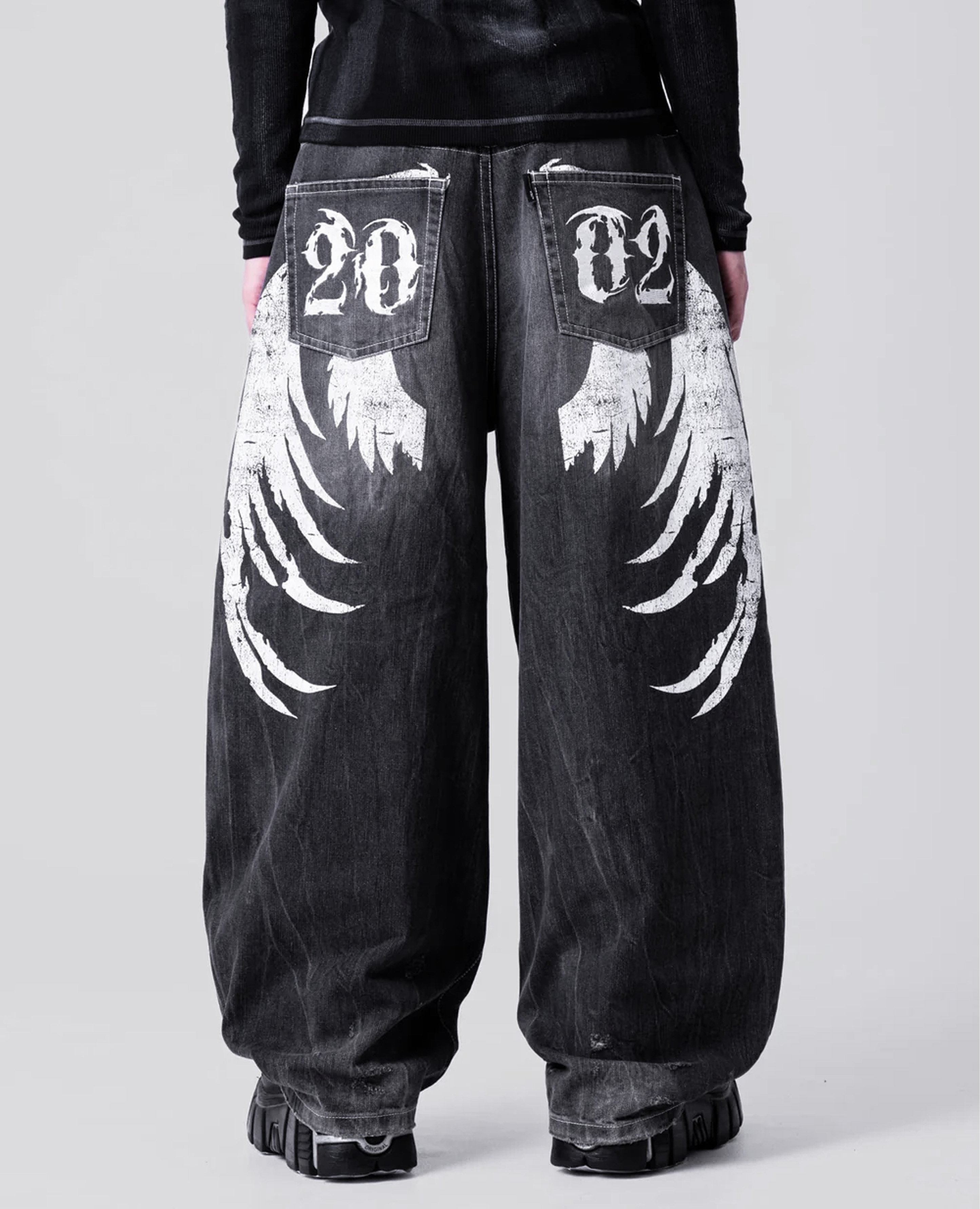 這條牛仔褲真的超有存在感。做舊、刮痕、破損處理,背面是大面積白色天使翼噴印,不是刻意痕跡,而是穿出來的感覺。版型是今年最主流的寬闊腿,落地線條很乾淨,配球鞋、靴子都能把比例撐起來。之所以進它,是因為安全的褲子我們很多了,但敢把背面做到這麼滿的,不多。穿出去很吸睛,但搭起來很酷。