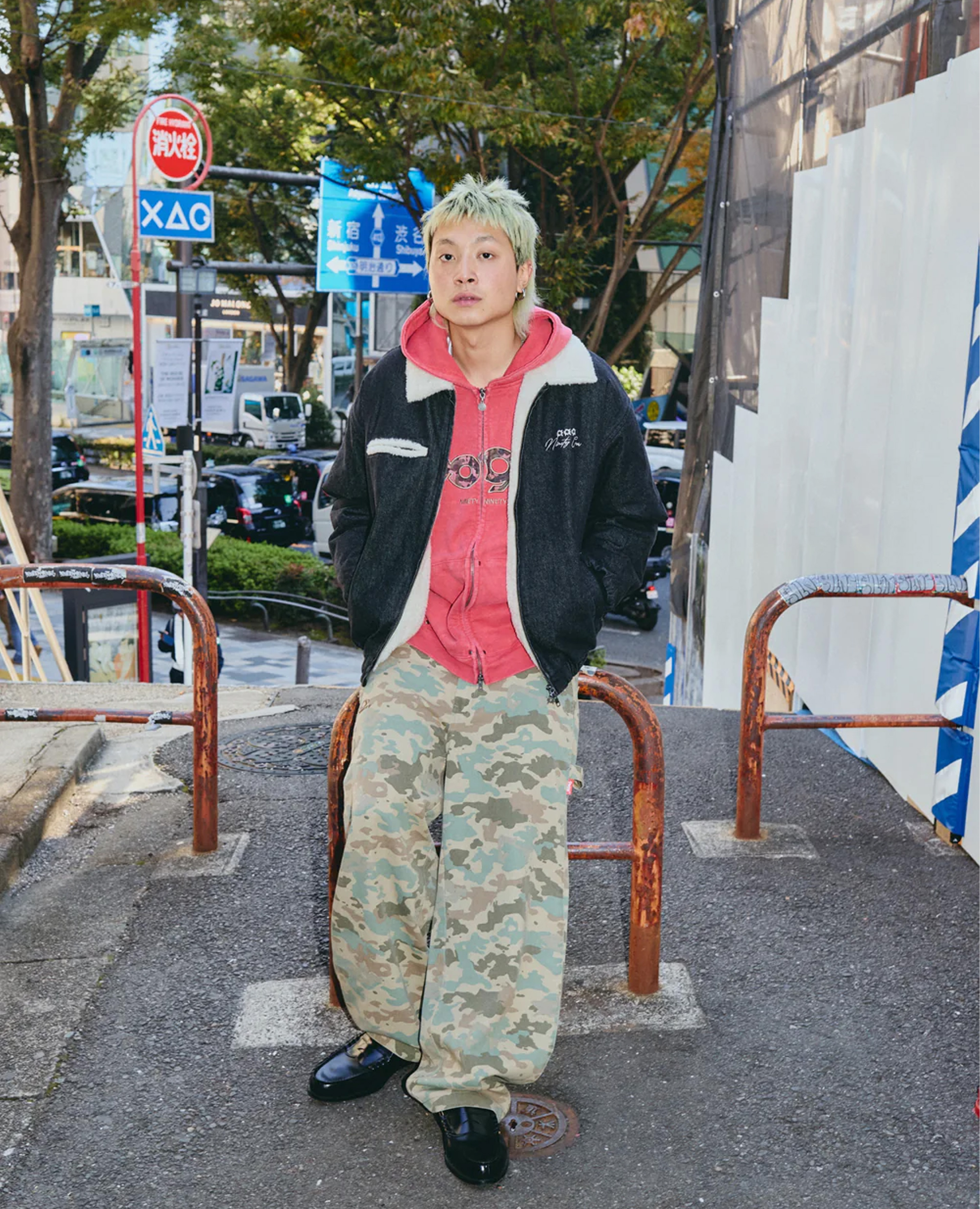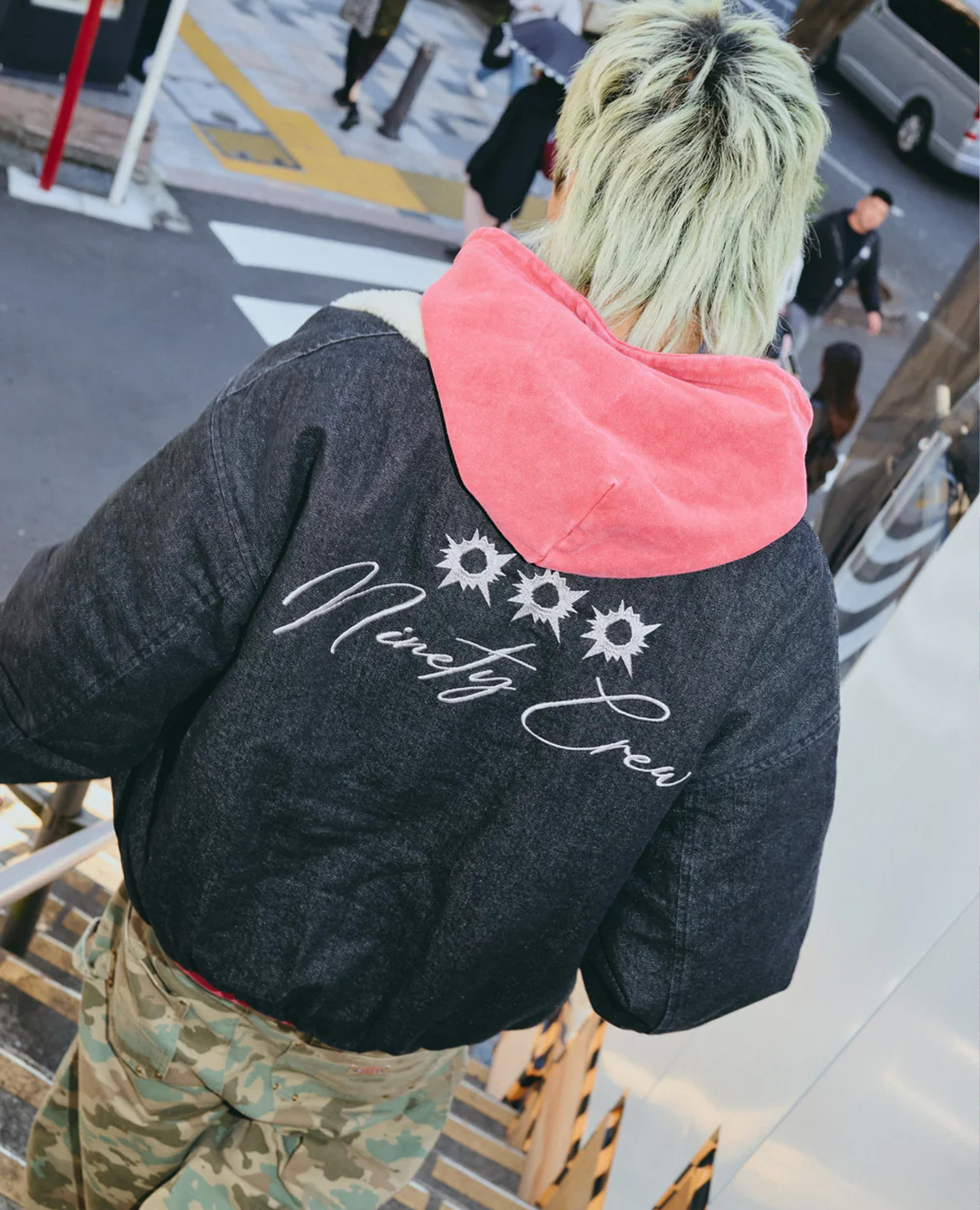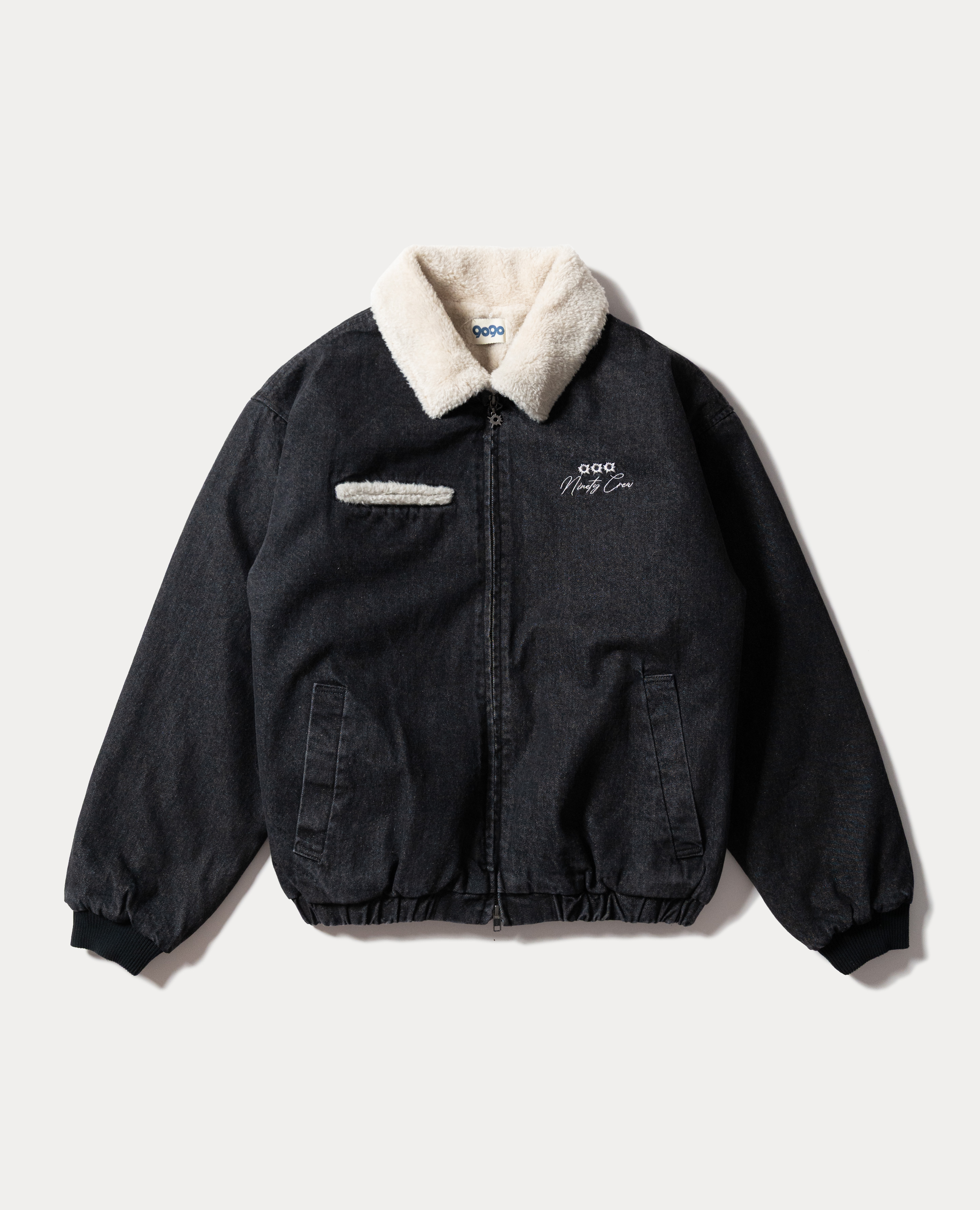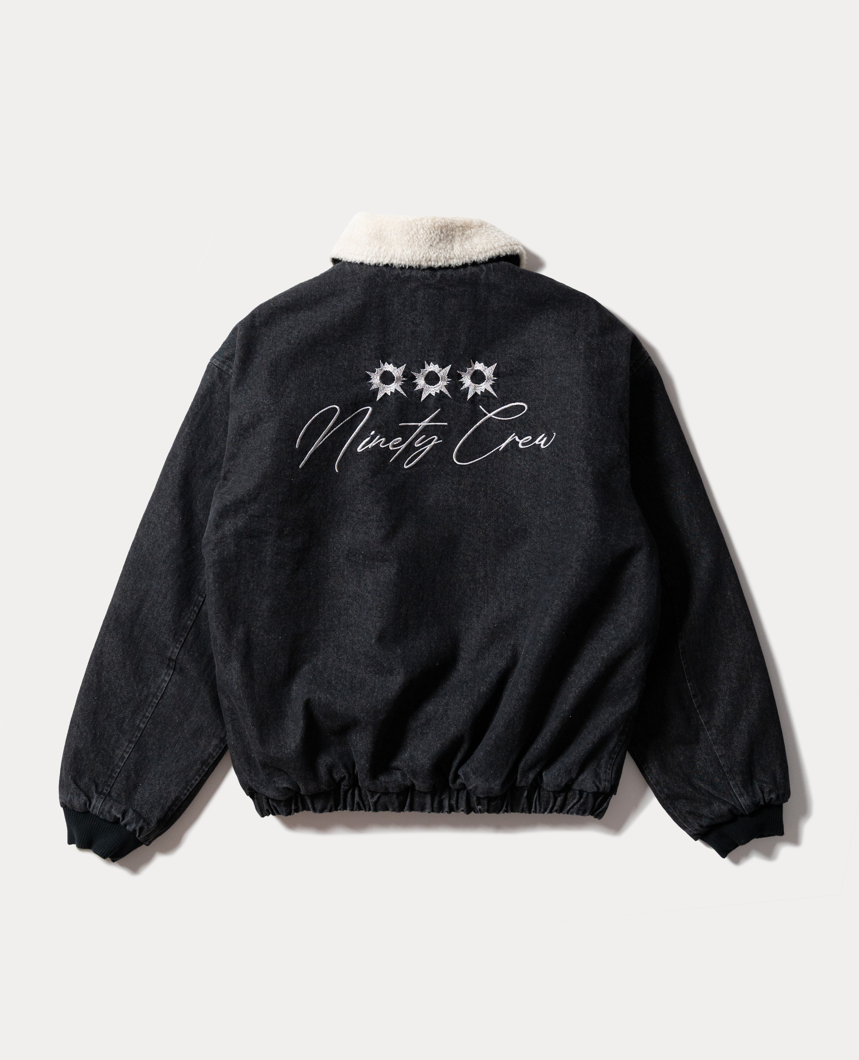 厚磅丹寧布料帶一點粗糙感, 配上毛領反而更顯得俐落。 背後是 Ninety Crew 的子彈孔刺繡, 不是張揚,是悶著火的那種態度。