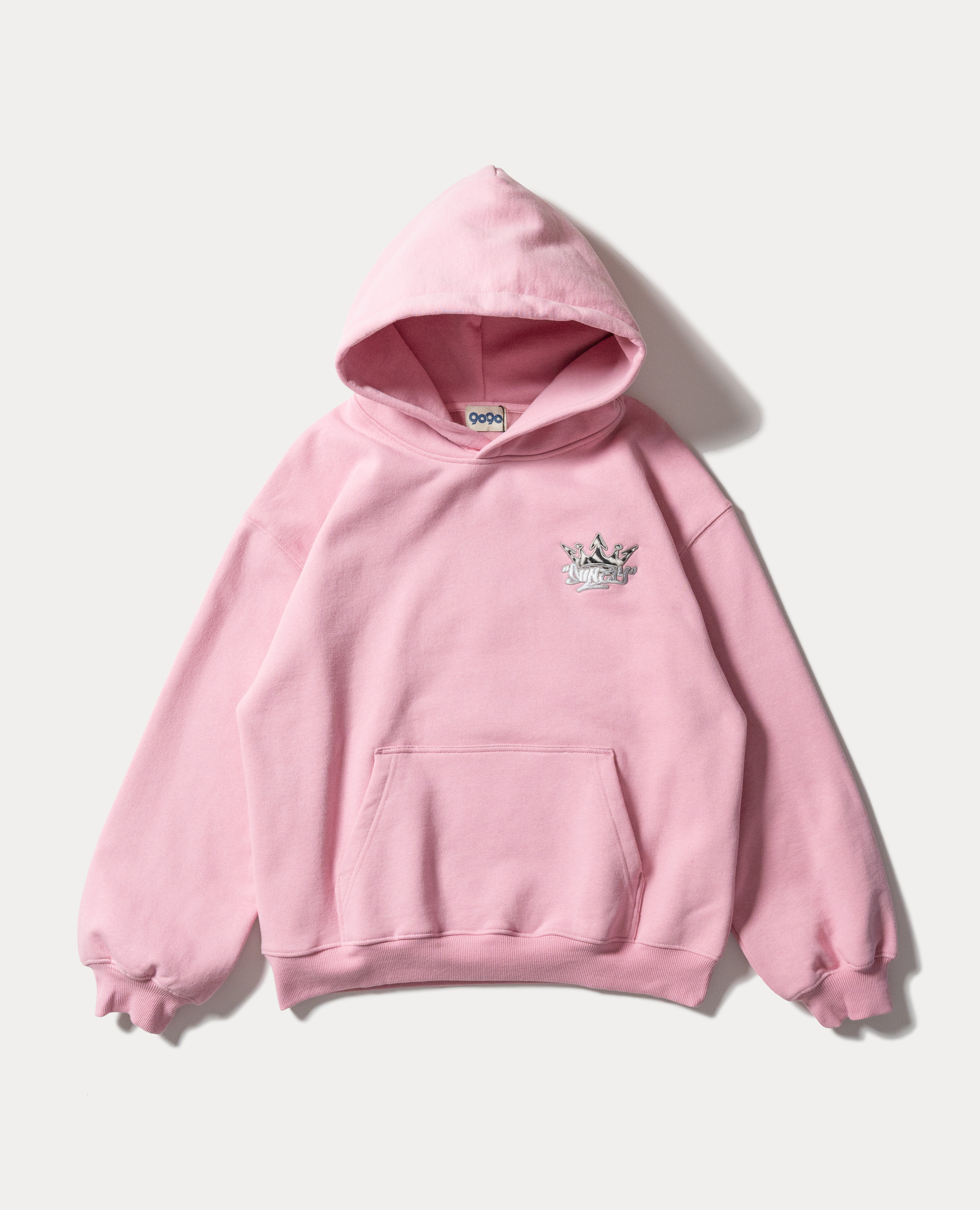 這件粉色帽T有點 Y2K,又帶一點日系感。顏色是霧霧的粉色,飽和但不會太亮。