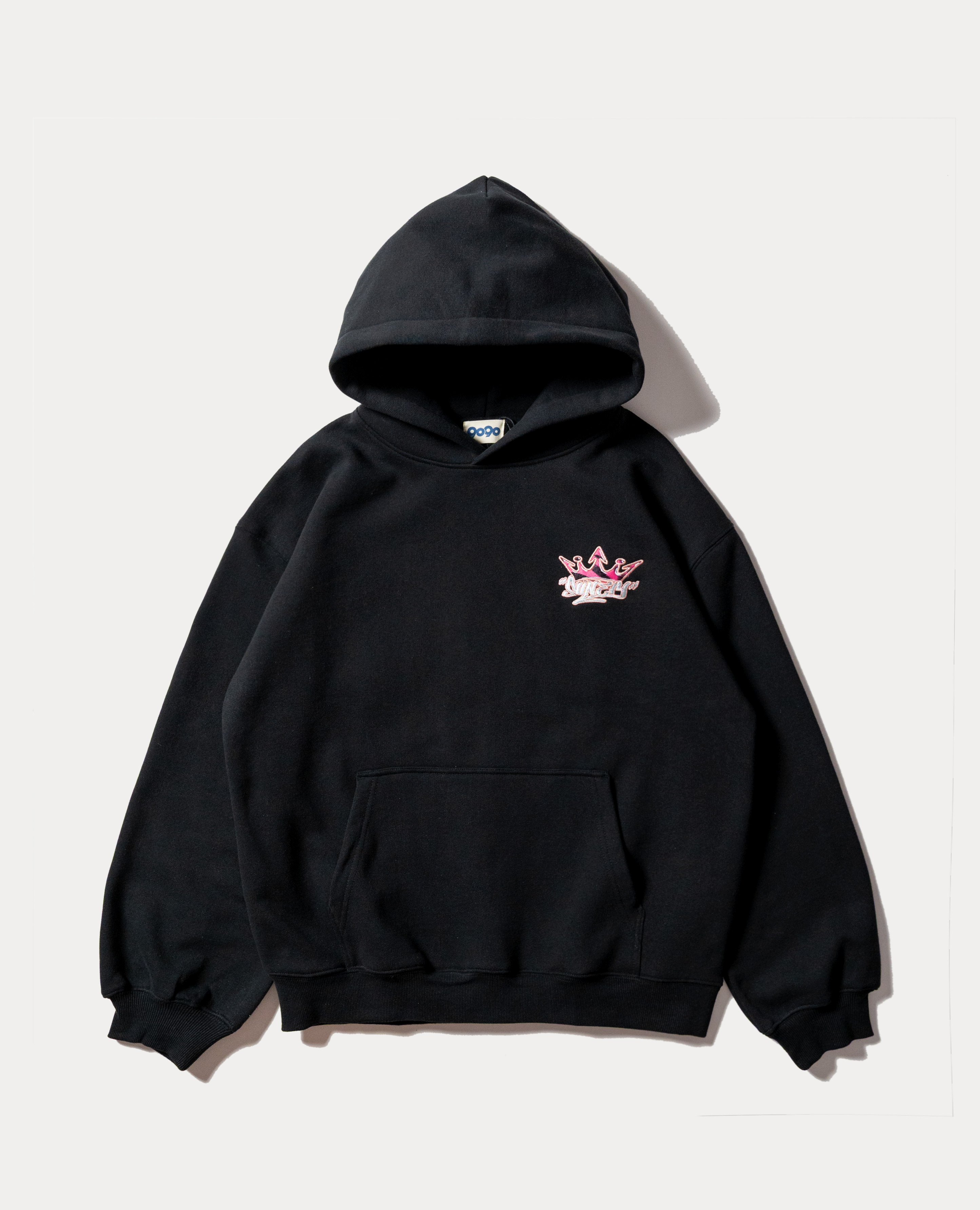 前面低調,背面直接開大絕。刺繡的皇冠 LOGO+粉色虎紋,把 9090 一直以來那種叛逆、Y2K、又不廉價的態度講清楚。厚度適中,秋冬單穿就好看,天冷加外套也不會卡。背後整片大圖在搭配上其實很好用。外面罩外套會留出剛好的份量,脫掉時視覺一次到位。棉褲、寬版水洗牛仔都OK,不需要想太多就能把比例撐起來。