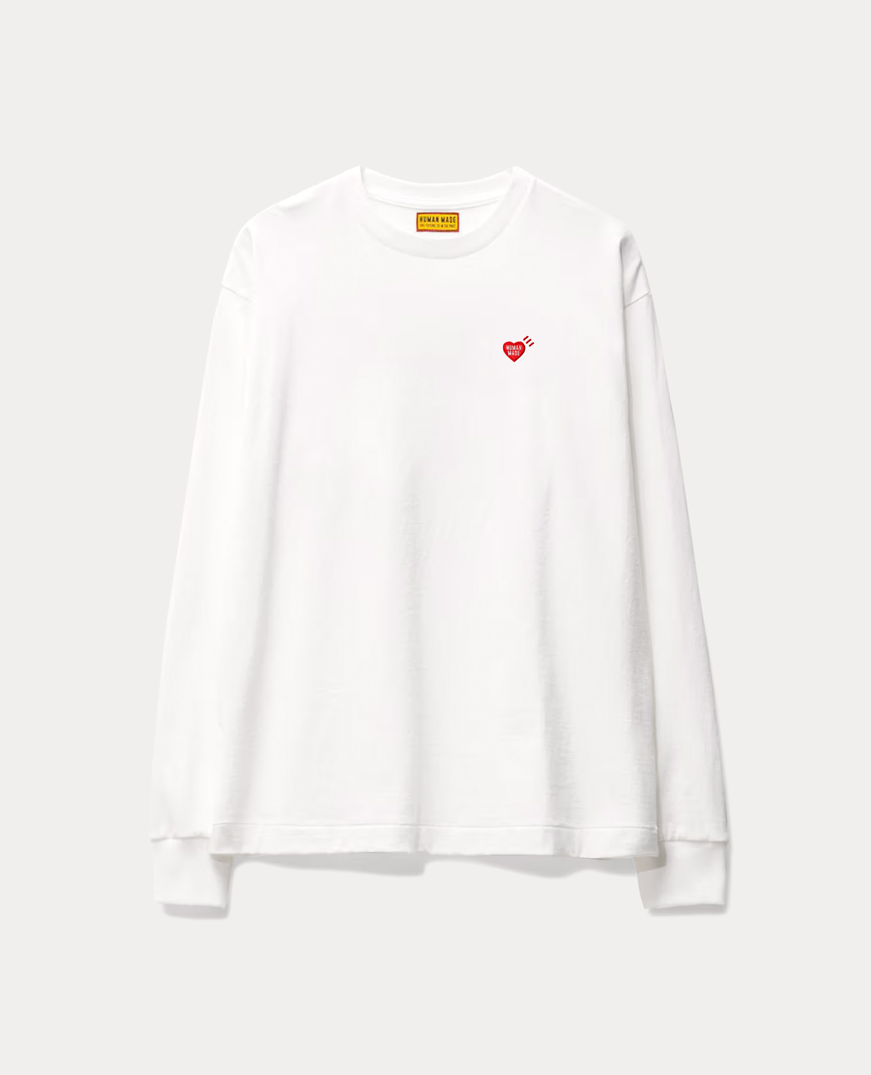 背面是一隻在富士山上滑雪的北極熊 (超可愛搭配 THE FUTURE IS IN THE PAST 字樣,是 HUMAN MADE 很代表性的視覺語言。正面保留小尺寸心形 Logo,視覺乾淨,重點集中在背後。寬鬆版型,單穿或內搭都合適,簡單搭牛仔褲、棉褲、寬褲都行。